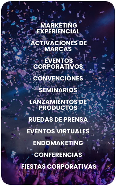 Recordemos que el propósito es plantar la mejor Experiencia en la mente de nuestra audiencia, por lo tanto, todos los esfuerzos que realicemos deben estar alineados con ello, no es momento de improvisar, no es momento de aprender cómo hacerlo bien, es momento trabajar con los mejores aliados y nosotros contamos con todo el conocimiento y a la experiencia para garantizar que tu evento sea un éxito.
